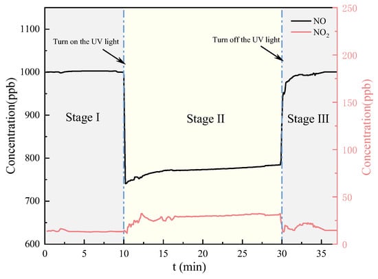 Stage II comprised the photocatalytic reaction phase, and the concentrations of NO and NO2 at the air outlet were recorded at a steady state.