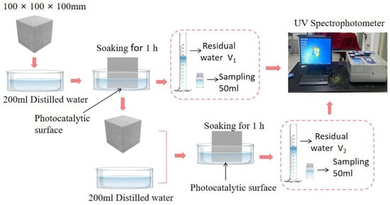 The test blocks were soaked in distilled water after the photocatalytic reaction, as shown in Figure 5. A nitrate elution test was then performed to characterize the residual amount of nitrate on the concrete surface after the rain washout. Finally, a portion of the soaking solution was extracted and tested for nitrate residue using a spectrophotometer (as shown in Figure 5). For each test sample, 5 mL of the immersion solution was collected separately and fixed at 25 mL. A volume of 0.5 mL of hydrochloric acid and 0.05 mL of sulfamic acid was added, and the elemental nitrogen content in the eluent was determined by measuring the absorbance at wavelengths of 220 nm and 275 nm.