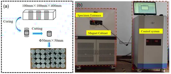 After every 50 F–T cycles, the nano-TiO2 concrete specimens (measuring 100 mm × 100 mm × 400 mm) were removed from the F–T testing machine. Cylindrical samples with a diameter of 50 mm and height of 50 mm (as shown in Figure 6a) were obtained using core drilling, with three cylindrical specimens prepared for each concrete specimen. Finally, the prepared NMR samples were vacuum-saturated with water for 24 h to ensure that their internal pores were fully saturated. The pore structure characteristic parameters of the photocatalytic concrete specimens (Φ50 mm × 50 mm) were then measured using a MesoMR23-060H-I NMR tester (Figure 6b).