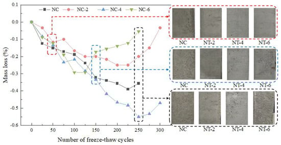 As shown in Figure 7, the surface of the NT-6 specimen exhibited noticeable spalling after 150 F–T cycles, with the mass loss rate also displaying an increasing trend. This suggested that NT-6 was the first to show signs of damage during the F–T process, with the mass of its surface spalling exceeding the mass added by pore water absorption. This phenomenon was attributed to the fact that NT-6 not only had the highest porosity internally but also had a larger percentage of macropores (as described in Section 3.3.2 of this paper). All of these reasons contributed to its more rapid damage during F–T cycles. The surface of the NC specimen also exhibited significant spalling damage. However, the mass loss rate continued to decrease because the increase in the water absorption mass during the F–T cycle was still greater than the spalling mass. At this point, there were no visible signs of spalling on the surfaces of the NT-2 and NT-4 specimens. The rate of mass loss for both the specimens continued to decrease, with NT-2 exhibiting the smaller decrease. This suggested that the increase in mass for both groups during the F–T cycles was mainly due to increased water absorption inside the concrete. Moreover, the relatively small increase in mass of the NT-2 specimen during the freeze–thaw process reflected its high compactness and low internal porosity (as described in Section 3.3.1 of this paper), which in turn led to a relatively low water absorption.