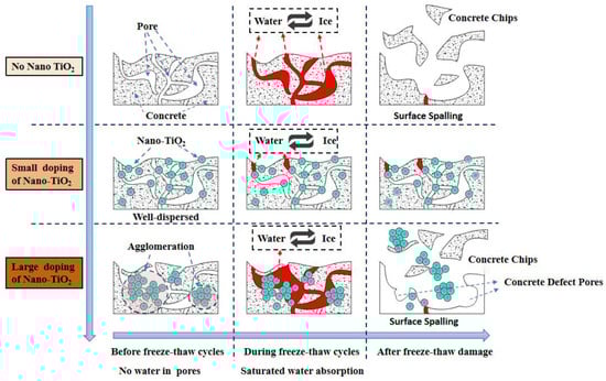 Mechanism of the effect of nano-TiO2 admixture on concrete mass loss during F–T cycles.