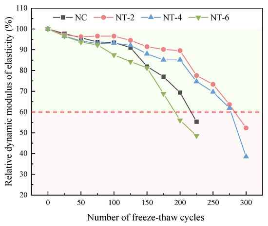 Before the number of freeze–thaw (F–T) cycles reached 50, the RDEM of TiO2 concrete with different dosages did not decrease by more than 7%. However, as the number of F–T cycles increased, the RDEM of TiO2 concrete varied with different dosages. The relationship between the RDEM at the same number of F–T cycles was as follows: NT-6 < NC < NT-4 < NT-2. Furthermore, according to GB/T50081-2019, the testing was stopped when the RDEM decreased to 60%. As illustrated in Figure 9, the relationship for the number of F–T cycles needed for the RDEM to decrease to 60% was also NT-6 < NC < NT-4 < NT-2. These test results indicated that adding an appropriate amount of nano-TiO2 could effectively slow down the decline of the RDEM of concrete, thereby prolonging its lifespan under F–T cycles. This was because nano-TiO2 helped prevent an increase in porosity and the expansion of microcracks within the concrete (as verified in Section 3.3.1), thereby reducing the extent of the decrease in the RDEM. However, as shown in Figure 9, NT-6 demonstrated the fastest decrease in the RDEM, suggesting that excessive use of nano-TiO2 could accelerate the F–T damage process in concrete, as discussed in Section 3.1.1.