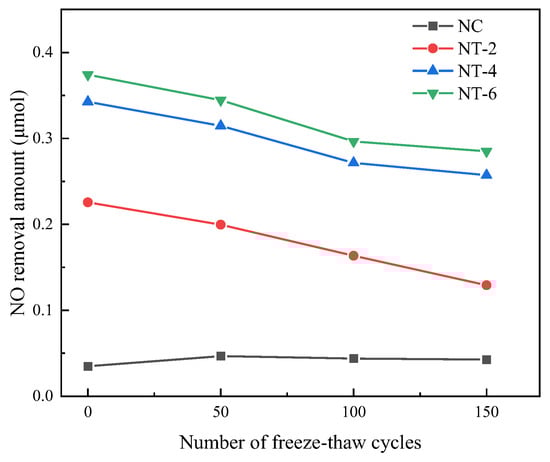NO removal from nano-TiO2 concrete for various numbers of F–T cycles.
