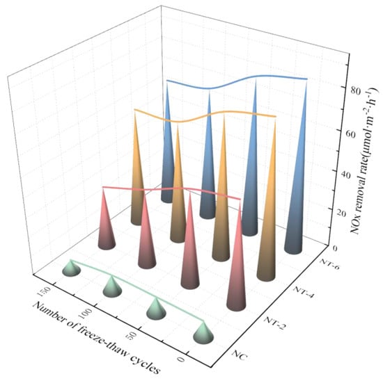 As shown in Figure 10 and Figure 11, both the NO removal and NOx removal rates were positively correlated with nano-TiO2 dosing in the interval of 0–150 F–T cycles. This was because when the photocatalytic reaction occurred on the surface of concrete, the addition of more nano-TiO2 exposed more molecules on the surface. This created more electron-hole pairs and increased the frequency of gas molecule adsorption and desorption during the reaction. As a result, the efficiency of the reaction improved, leading to increased removal of NO and higher NOx removal rates. Furthermore, ordinary concrete (NC) also exhibited some NOx removal, but the rate of removal was not as high as that of nano-TiO2 concrete. This was owing to the porous structure of the concrete, which could thus adsorb NO gas. Moreover, the unstable chemical properties of NO gas resulted in a portion of NO being converted into NO2 or nitrate, which remained on the surface of the concrete pores.