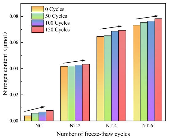 The nitrogen content in the nano-TiO2 concrete eluate in the F–T environment is illustrated in Figure 12. It showed a significant positive correlation with the nano-TiO2 dosage because there was a positive correlation between the nano-TiO2 dosing and the concrete NOx removal rate. With an increase in the nano-TiO2 dosage, the NOx removal rate of concrete increased, such that the residual nitrate on the surface of the concrete also increased. Moreover, the concentration of elemental nitrogen in the eluent gradually increased as the number of freeze–thaw cycles increased. This was because the F–T damage shown in Figure 10 and Figure 11 resulted in a gradual decrease in the NO and NOx removal rates of the nano-TiO2 concrete. However, this damage increased the porosity and cracking of the concrete (as confirmed in Section 3.3.1), thus making it easier for the nitrate on the concrete surface to dissolve in the eluent solution. As a result, there was a smaller increase in nitrogen concentration in the eluent solution. Therefore, F–T damage caused a reduction in the photocatalytic NOx degradation performance of the nano-TiO2 concrete. However, after experiencing F–T damage and exposure to rainfall, it became more challenging for nitrate to remain on the surface of the concrete. This was beneficial for the long-term and safe use of TiO2 photocatalytic concrete components in natural environments.