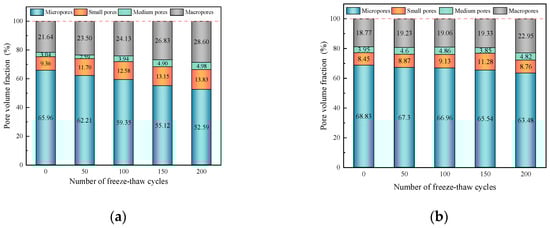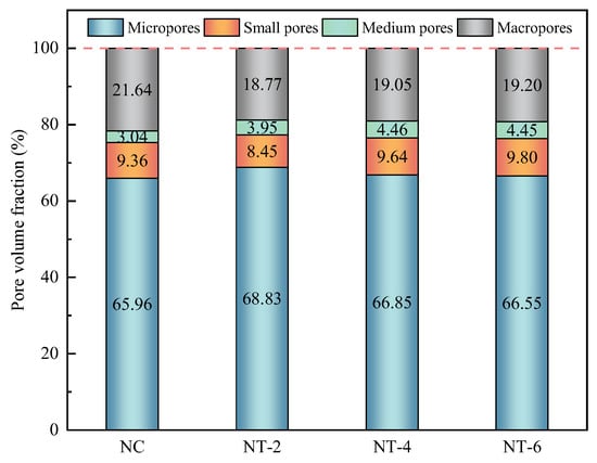 The pore size distribution of concrete significantly affected its frost resistance. Zhou et al. [28] found that a pore size of less than 20 nm was harmless during the freeze–thaw cycles. Fan et al. [29] considered that a pore size greater than 100 nm was harmful, and the volume of harmful pores would increase significantly during freeze–thaw damage. In addition, the particle size of nano-TiO2 in this test was 100 nm, which had a greater influence on the pore structure with pore sizes greater than 100 nm. In this study, the pore size of the concrete was categorized into four groups: micropores (<20 nm), small pores (20–100 nm), medium pores (100–200 nm), and macropores (>200 nm). Figure 14 presents the pore volume fractions of non-freeze–thawed nano-TiO2 concrete for various pore sizes, with the majority of the volume being microporous. The incorporation of nano-TiO2 in concrete led to an increase in the volume fraction of micropores and medium pores, while the volume fraction of large pores decreased. This suggested that nano-TiO2 effectively filled large pores, enhanced the volume fraction of smaller pores, and improved the overall compactness of the concrete. Furthermore, as the dosage of nano-TiO2 increased, the volume fraction of micropores gradually decreased, whereas the volume fraction of macropores gradually increased. This trend indicated that the filling effect diminished with higher doses of nano-TiO2, and the agglomeration of nano-TiO2 contributed to the formation of macropores.