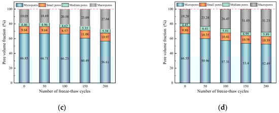 Pore volume fraction of nano-TiO2 concrete at various numbers of F–T cycles. (a) NC. (b) NT-2. (c) NT-4. (d) NT-6.