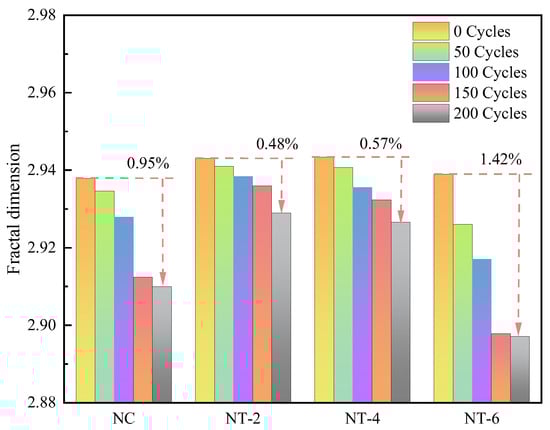 Figure 17 provides an analysis of the evolution of the fractal dimension of the pores in nano-TiO2 concrete, focusing specifically on those with a pore size of 100 nm or greater. As illustrated in Figure 17, the fractal dimensions of pores larger than 100 nm in nano-TiO2 concrete were consistently greater than those in ordinary concrete (NC). This suggested that the filling and nucleation effects of nano-TiO2 contributed to a more complex internal pore structure in the concrete. Consequently, a higher fractal dimension in nano-TiO2 concrete indicated a stronger resistance to F–T damage. Additionally, as the number of F–T cycles increased, the fractal dimension of pores larger than 100 nm gradually decreased. This trend indicated that smaller pores within the concrete were transforming into larger pores during the F–T damage process, which ultimately weakened the complexity of the internal pore structure. After 200 freeze–thaw cycles, the fractal dimensions of pores larger than 100 nm followed this order: NT-2 > NT-4 > NC > NT-6. Furthermore, the decrease in the fractal dimension of the concrete before and after F–T cycles adhered to the same order: NT-2 > NT-4 > NC > NT-6. These results reinforced the conclusion from Section 3.1 that a moderate amount of nano-TiO2 could help mitigate the F–T damage process. However, when the amount of nano-TiO2 was excessive, the internal defects caused by its agglomeration could accelerate the F–T damage process (e.g., NT-6).