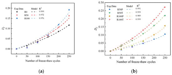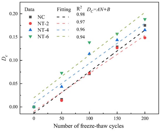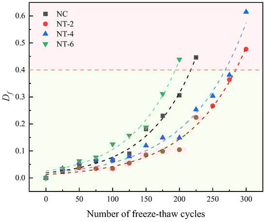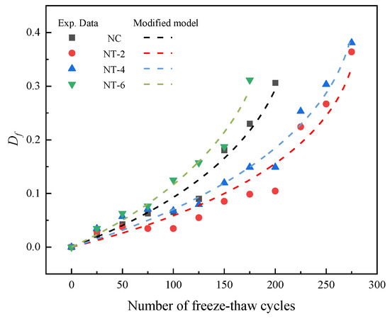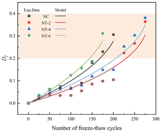 where is the number of F–T cycles when the damage factor reaches the critical value Df = 0.4. A comparison of the modeled and tested values of the concrete damage at different numbers of F–T cycles is presented in Figure 20, and the modeled parameters are listed in Table 5.