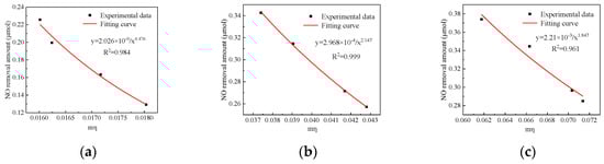 The amount of NO removed () and the increase in NO2 () were calculated using Equations (3) and (4), respectively.