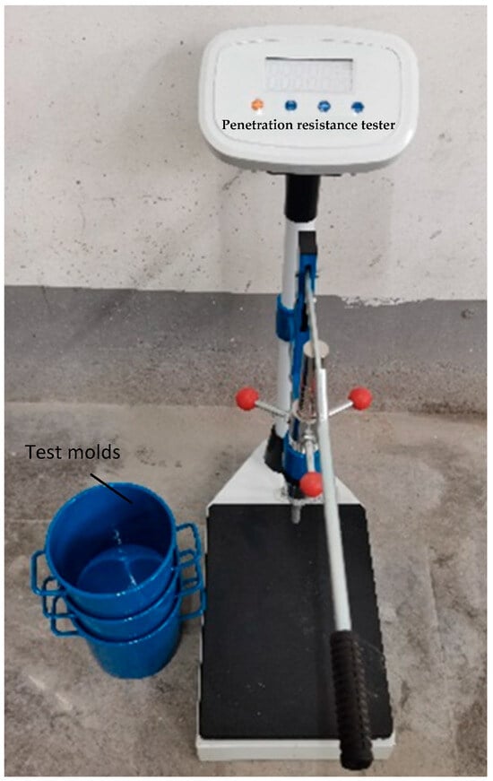 According to the test method in GB/T 50080-2016 [], the setting time of concrete was measured. The tests were carried out using the HG-80 penetration resistance tester, as shown in Figure 1 to determine the initial and final setting times of the concrete. The concrete was sieved using a sieve with an aperture diameter of 5 mm to obtain the slurry. Then, it was poured into three test molds (see Figure 1). The upper diameter of the test molds was 16 cm, the lower diameter was 15 cm, and the depth was 15 cm. Three barrels were filled with concrete. The concrete in the three test molds was inserted with a vibrating rod at least 25 times and then smoothed and placed on the bottom plate of the penetration resistance meter. The concrete in the test mold did not exceed 5 mm from the opening of the test mold. The height of the penetration needle was adjusted to a distance of no more than 5 mm from the upper plane of the material cylinder according to the operating instructions for the concrete penetration resistance tester. After the completion of the adjustment, the pressure rod was used to conduct the test with a penetration depth of 2.5 cm. Each specimen underwent at least six penetration resistance tests. The last penetration resistance per unit area was not less than 28 MPa. The main material composition of C60 concrete provided by the concrete manufacturer is shown in Table 1. It was the same as the concrete used in the actual engineering bridge widening construction. The initial setting and final setting time of C60 concrete are shown in Table 2. It can be seen that the initial setting time of C 60 concrete was 3 h, and the final setting time was 7 h.