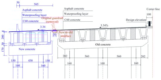 This study took the widening project of two existing bridges in the Lin’an Jiande section of the Linjin Expressway in China as the background. Before widening, the old concrete guardrail at the widening edge of the old bridge was removed, and the gap between the new and old bridges was filled and spliced through wet joints. Before pouring concrete into the wet joints, the existing bridge section was cleaned and leveled, then drilled for reinforcement, and then connected to the wider bridge. Traffic was not interrupted during construction. The disturbance caused by driving loads ran through the entire process of concrete solidification and hardening at the wet joint. Therefore, to make the test closer to the actual engineering conditions, the effect of traffic disturbance on the strength of high-strength (C60) concrete at different ages was investigated by applying the traveling disturbance to the new concrete at the initial, initial-final and final setting stages. Then, the splitting tensile strength tests were carried out to investigate the effect of traffic vibration on the splitting tensile strength of new-to-old concrete interfaces at bridge-widening wet joints.