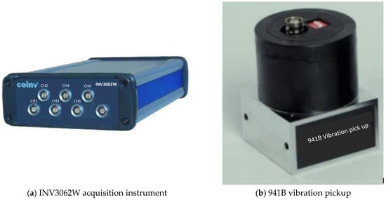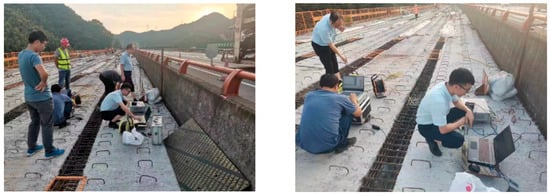 To truly and accurately study the effect of traffic disturbance on the concrete properties of bridge-widening wet joints, this article relies on the bridge-widening project of Lin’an to Jiande section of Linjin Expressway in China. The cross-sections of the widening bridge are shown in Figure 2. Due to the uninterrupted traffic, the traffic flow had a greater impact on the determination of the disturbance parameters. A dynamic test system was used to determine the bridge vibration parameters caused by traveling loads. The test system mainly consisted of a vibration pickup, a signal amplifier, a signal acquisition instrument, and a vibration testing and analysis system. The vibration signal of bridge vibration was converted into an analog signal by the vibration pickup, which was amplified by the signal amplifier and transmitted to the signal acquisition instrument. The signal acquisition instrument took the amplified analog signals for data acquisition and converted the analog signals into digital signals through the A/D conversion module. Sampling parameters were collected and controlled by a signal acquisition instrument INV3062W produced by Beijing Oriental Institute of Vibration and Noise Technology in Beijing, China and a field monitoring computer Dell P61F produced by Dell Technologies in Round Rock, TX, USA. Various bridge dynamic data collected in the field were analyzed by dynamic test analysis and modal analysis software Artemis Modal Pro v7.2.2.6 for bridge vibration test analysis and bridge vibration modal analysis. The vibration parameters were measured without interrupting the traffic. There were differences in the traffic flow in different periods, and the traffic load caused different degrees of forced vibration of the bridge. Therefore, the dynamic response of the bridge was measured to analyze, and the vertical vibration amplitude and frequency of the bridge caused by the traffic load were ultimately obtained. The instrument used for the test was the INV3062W acquisition instrument and the 941B vibration pickup as shown in Figure 3. The on-site testing images are shown in Figure 4. After calculation and analysis, it was found that the forced vibration frequency of the bridge was around 2 Hz, and the vibration amplitude was 1 mm when the traffic flow (1500 vehicles/h) was small. When the traffic flow (3500 vehicles/h) was large, the forced vibration frequency of the bridge was around 4 Hz, and the vibration amplitude was about 3 mm.