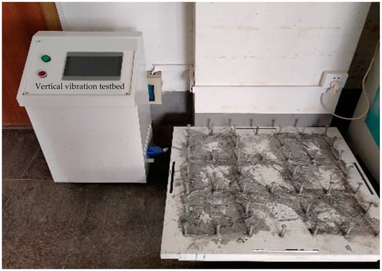 In the last two decades, different vibration effects on the mechanical properties of concrete have been investigated by indoor experiments and on-site tests. Harsh et al. [,] studied the effect of traveling vibration on the compressive strength of newly poured concrete for repairing bridges, and the bond between reinforcement and concrete. The results showed that continuous vibration at the beginning of pouring reduced the compressive strength of the plastic concrete by 10% and the bond strength by 5.9%, which had a negative effect on the mechanical properties of the concrete. Issa et al. [] simulated the deformation of concrete bridges under the vibration of traffic load. They concluded that the vibration of traffic load had a significant effect on the early strength of concrete. The early strength of concrete was affected by the vibration of traffic load when the concrete was poured for 7~8 h, and the vibration of traffic load affected the early strength of concrete. Dunham et al. [] studied the two peak vibration speeds and five starting times of the mechanical properties of concrete and found that the vibration on the compressive strength of the impact was not significant, while the flexural strength had an adverse effect, the maximum loss of flexural strength of about 8%. Jiang et al. [] found that an increase in the frequency of axle-coupled vibration exacerbated the degree of early segregation of concrete, reduced the uniformity and compactness of concrete, in the early and late stages of concrete setting and hardening, and the impact of traveling vibration on the performance of concrete was relatively small; traveling vibration occurred in the middle stage of setting and hardening, the impact of the mechanical properties of concrete was greater. Zhang and Xu [] investigated the changes in compressive strength of concrete from a microscopic point of view by applying indoor perturbations of various parameters in combination with an acoustic emission device during the initial and initial-final setting stages of concrete. It was found that the compressive strength of concrete was improved when the disturbance was applied at the initial setting stage and decreased when the disturbance was applied at the initial–final setting stage. Li et al. [] measured the frequency and amplitude of vibration in different directions during concrete placement and simulated the effect of three-dimensional disturbance on the mechanical properties of concrete. It was found that the compressive strength of the concrete specimens decreased by about 15% one hour before and after the initial setting of the concrete. Dai and Li [] improved the effect of disturbance on the mechanical properties of concrete by mixing basalt fibers in concrete. It was found that when the volume fraction of basalt fibers is 0.1%, it can effectively improve the phenomenon of concrete delamination caused by disturbance. However, the concrete strength grade of C20 used in the experiments is more limited and a lot of subsequent experimental studies are needed. Pan et al. [] applied different durations of disturbance during the initial and final setting stages of concrete and found that the increase in disturbance duration did not change after the compressive strength of the concrete decreased to a certain value, while the flexural strength showed greater damage as the disturbance duration increased.