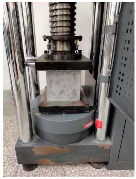 With reference to GB/T 50107-2010 [], the loading speed of the compressive strength test was taken as 0.8~1.0 MPa/s. The loading speed of the press was controlled to load continuously and uniformly. The testing instrument was a 30 t press, as shown in Figure 6. Each cubic compressive strength of concrete was calculated using Equation (1). The average of the compressive strengths of the three specimens was as the compressive strength of concrete.