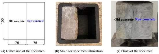 With reference to GB50152-2012 [] and JGJ55-2011 [], 24 groups of new-to-old concrete surface splitting tensile strength specimens. Each group has 3 specimens. Each specimen consisted of two parts spliced together, simulating the inherent old concrete of the old bridge and the widened new concrete structure. The old concrete specimens were produced 1 year in advance. After production, they were placed in a standard rapid concrete curing box for 1 month before being taken out, and then they were placed in a natural state for curing. The old concrete was cut in half to obtain 150 mm × 150 mm × 75 mm specimens. New concrete specimens were made of C60 concrete with a size of 150 mm × 150 mm × 75 mm.
