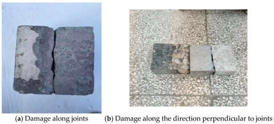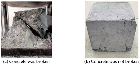 At the beginning of loading, slight vertical cracks slowly began to appear on the surface of the pressurized part of the test specimen. With the gradual increase in the load, the cracks began to grow and spread around, mainly along the vertical development of the specimen, and gradually turned into larger vertical cracks, while the concrete specimen was also constantly deformed, with fine powder falling. When the concrete specimen reached the limit load, most of the specimens appeared in vertical penetration cracks and transverse cracks on the pressurized surface. After 28 d of curing and 3 h of vibration, the specimens suddenly exploded and made a loud noise, breaking into several small pieces and powder, as shown in Figure 9a. Except for the specimens that were cured for 28 d and vibrated for 3 h, the others were not broken, as shown in Figure 9b.