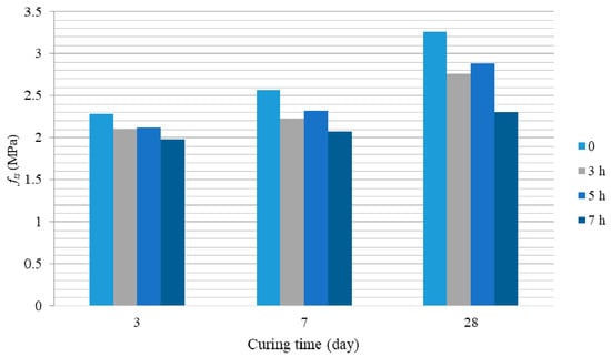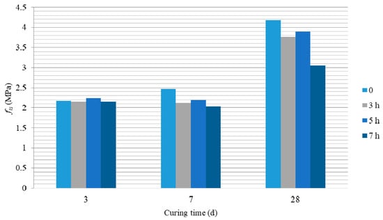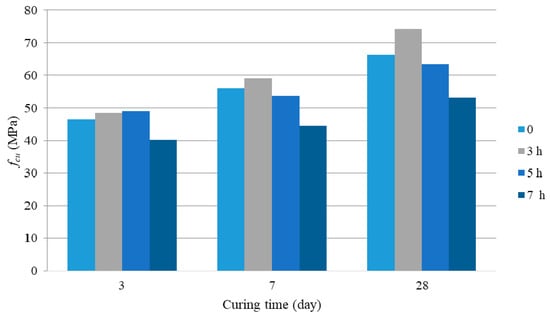 The calculated results of the 12 sets of specimens measured in the compressive strength experiments are shown in Table 5. To intuitively analyze the effect of traveling load disturbance on the compressive strength of concrete at different stages, the results are plotted in Figure 10. Compared with the specimens without vibration, the compressive strength of the specimens cured for 3 days and vibrated for 3 h increased by 4.3%, the compressive strength of the specimens cured for 3 days and vibrated for 5 h increased by 5.2%, the compressive strength of the specimens cured for 3 days and vibrated for 7 h decreased by 13.7%. Compared with the specimens without vibration, the compressive strength of the specimens cured for 7 days and vibrated for 3 h increased by 5.7%, the compressive strength of the specimens cured for 7 days and vibrated for 5 h decreased by 3.9%, the compressive strength of the specimens cured for 7 days and vibrated for 7 h decreased by 20.4%. Compared with the specimens without vibration, the compressive strength of the specimens cured for 28 days and vibrated for 3 h increased by 11.9%, the compressive strength of the specimens cured for 28 days and vibrated for 5 h decreased by 4.4%, the compressive strength of the specimens cured for 28 days and vibrated for 7 h decreased by 19.9%. It can be concluded that the traffic disturbance had little effect on the compressive strength of the specimens at the initial and initial to final set stages, significantly decreased that at the final set stage; the impact of continuous disturbance on concrete can be mainly divided into compaction and destruction; proper vibration can promote a more uniform distribution of cementitious materials and aggregates, as well as accelerate the cement hydration reaction, making the concrete more compact; however, prolonged disturbance can cause the internal slurry of the concrete upward floating to sink, resulting in layered segregation and a significant decrease in concrete strength [].
