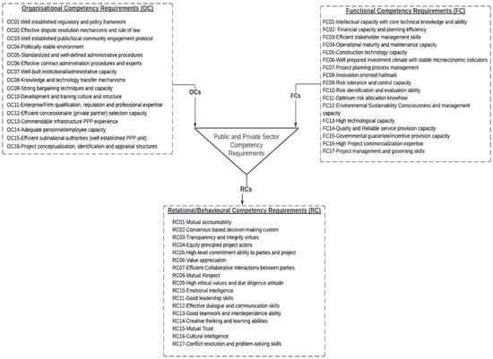 The development of competency requirements is extensive; therefore, studies achieve this feat by categorising them. The categorisation adopted in this study followed a theoretical ideology that describes the combination of knowledge, skills, and characteristics needed to effectively perform from the private and the public sector perspective. This enabled the siphoning of adequate and exhaustive variables or indicators to be measured. This study proposes that competency capability requirements fall into three main categories that must work collectively to support the public and private parties in achieving mutually beneficial outcomes in PPP schemes. This integrated approach strengthens the critical role of each party, enhancing the likelihood of a successful, win-win partnership.