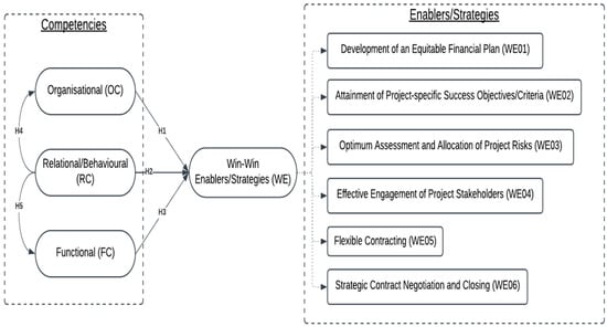Eshun et al. [] evidencing a comprehensive literature review highlighted enablers of win-win achievement in PPP as the development of an equitable financial plan (WE01), attainment of project-specific success objectives/criteria (WE02), optimum assessment and allocation of project risks (WE03), effective engagement of project stakeholders (WE04), flexible contracting (WE05), and strategic contract negotiation and closing (WE06). The moderating role of private and public sector competencies in implementing these enabling strategies cannot be understated []. This underscores the concept that relational, functional, and organisational competencies collectively drive the achievement of win-win outcomes in PPPs. The identified variables were validated through expert interviews projecting the hypothesised model shown in Figure 2. The study engaged six experts in finalising the research framework. Research Hypothesis H1, H2 and H3 posit that organisational, relational/behavioural and functional competencies of the public and the private sectors have a positive influence on the win-win enablers/strategies. The study further theorises the mediating role of the functional and organisational competencies to the relational/behavioural competencies, hence testing H4 and H5, as seen in Figure 2.