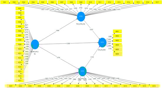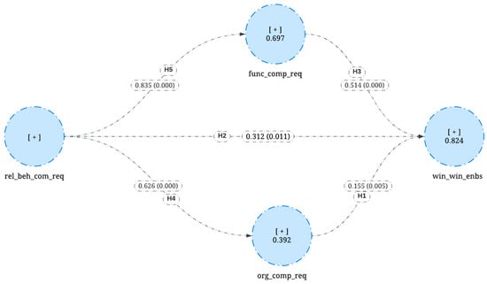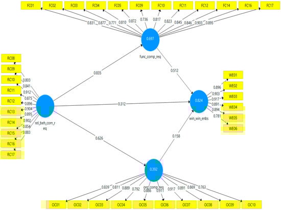 The evaluation of the initial model revealed that several observed variables failed to meet the required loading thresholds of 0.7. To enhance the model and ensure optimal results, these variables were removed, and the analysis was conducted iteratively while carefully monitoring both construct and scale reliability criteria []. The final measurement is illustrated in Figure 4, demonstrating acceptable factor loadings (see Table 8), along with confirmed construct reliability and validity (Table 9) and discriminant validity (Table 10). The results indicate that all reflective loadings exceeded the 0.7 threshold. Specifically, the highest and lowest loadings recorded were 0.903 and 0.736 for functional competency requirements, 0.917 and 0.763 for organisational competency requirements, 0.912 and 0.803 for relational behavioural competency requirements, and finally, the win-win enablers had loadings of 0.917 and 0.781. Furthermore, the reliability results—measured by Cronbach’s Alpha, rho _A, and composite reliability (CR)—were all above 0.7, indicating strong reliability. Additionally, convergent validity was confirmed, as the average variance extracted (AVE) for each component exceeded the largest squared correlation with any other latent component []. The HTMT correlations also fell within the acceptable range based on the criteria established for the study. The final model, after thorough scrutiny and iterative eliminations that met all necessary specifications, demonstrates that the constructs adequately measure their intended variables. Therefore, it is deemed suitable for further analysis within the structural model [].