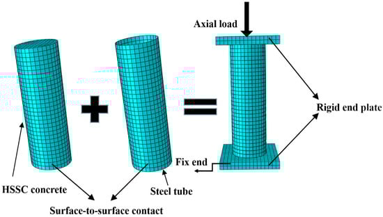The Coulomb Friction Model was employed to imitate the general bond strength in tangential contact behaviour. In the surface-to-surface contact option, the steel tube was designated as the slave surface while the core high-strength self-compacting concrete surface was chosen as the master surface. The friction coefficient between the steel tube and the HSSC concrete was considered to be 0.6, as suggested by Yu et al. []. The ultimate shearing stress was fixed at 0.4 MPa []. Additionally, the surface-based interactions were also implemented between the end plates and the core HSSC concrete. Moreover, the top and bottom end plates were interconnected with steel tubes through a “Tie” constraint, ensuring that the end plates maintained identical displacements and rotations throughout the entire loading process.