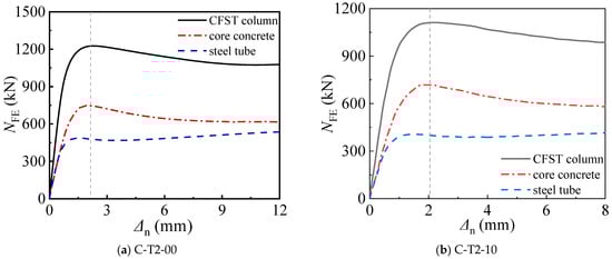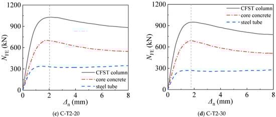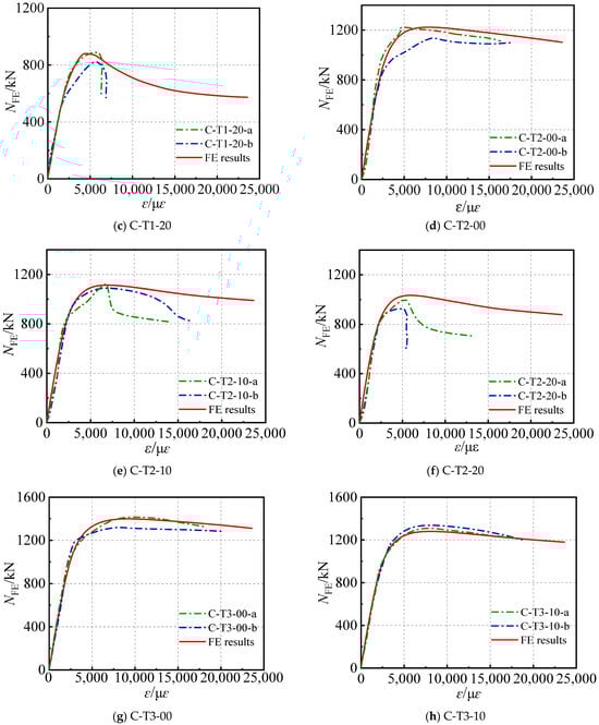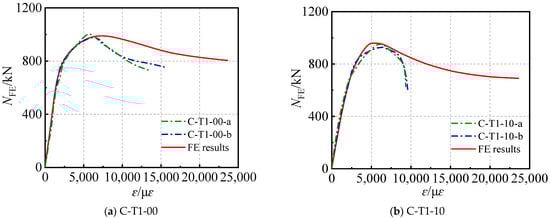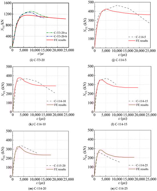 The axial strain (ε)-axial load (N) curves obtained both from experimental and FE results are shown in Figure 2. Evidently, the ε-N curves calculated by FE models have a good agreement with the ones obtained from test results, particularly in terms of the initial stiffness and ultimate axial compressive strength. Nevertheless, the descending stages of the curve simulated by FE models were with some deviations from the experimental results. This part of the curve is determined by Equation (8), where the used parameters are related to the area of core concrete, steel tube, the shape, and residual strength. These parameters cannot be directly controlled by the confinement coefficient, due to the influence of chloride corrosion. Therefore, the descending branches of curves match well with experimental results such as C-T2-00-a, C-T2-10-a, C-T3-00-a/b, and C-T3-10-a/b, whereas specimens such as C-114-5 and C-114-10 exhibit less congruence with the test data.