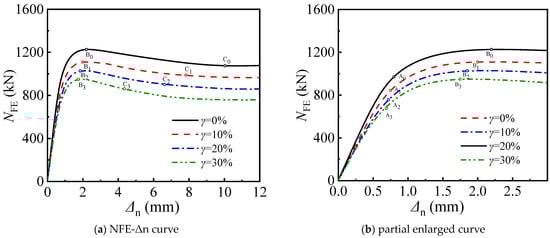 Axial load versus axial deformation in the whole compression process: (a) NFE-Δn curve; (b) partial enlarged curve. Note: A0–A3, B0–B3, C0–C3 represents the characteristic points corresponding to corrosion rate of 0%, 10%, 20%, and 30%, respectively.