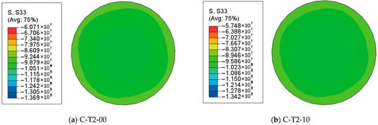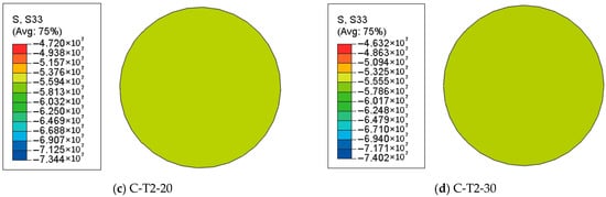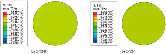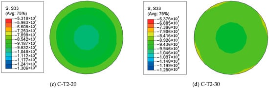 Figure 5, Figure 6 and Figure 7 represent the S33 stress distribution of HSSC-CFST stub columns at distinct characteristic loading stages (point Ai, Bi, and Ci) with different chloride corrosion rates in the mid-height section. At the end of the elastic stage, the longitudinal stress distributes uniformly in the whole section. The stresses of the columns are in the range of 57.16–59.37 MPa, 56.63–58.88 MPa, 55.94–58.13 MPa, and 55.55–57.86 MPa, respectively, corresponding to the corrosion rate of 0%, 10%, 20%, and 30%. The average longitudinal stresses are 58.27 MPa, 57.76 MPa, 57.04 MPa, and 56.71 MPa, which indicate that the core high-strength self-compacting concrete are in the elastic stage. The average longitudinal stress decreases by 0.88%, 2.11% and 2.68% when the corrosion rate increases from 0% to 10%, 20%, and 30%. This indicates a slight impact of chloride corrosion on longitudinal stress during the elastic phase.