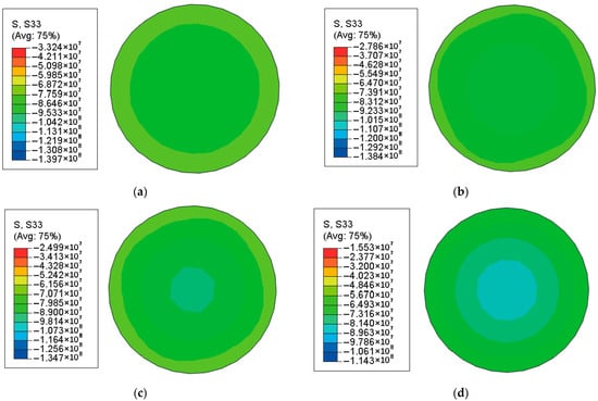As shown in Figure 6, the maximum stress occurs in the center region and decreases sequentially toward the periphery of the section in a circular pattern. This pattern suggests a heightened confinement effect in the central region. The longitudinal stresses decrease by 2.81%, 6.72%, and 9.94% with the corrosion rate increasing from 0% to 10%, 20%, and 30%. The higher the corrosion rate, the larger of the confinement effect. This is due to the deterioration of the steel tube properties induced by chloride corrosion, which weaken the confinement effect of the steel tube.