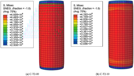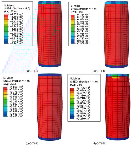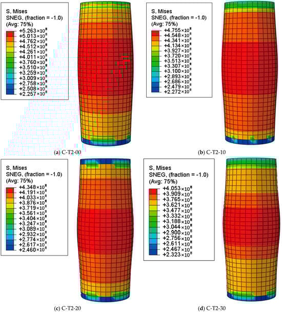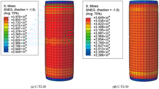 Figure 8, Figure 9 and Figure 10 represent the Mises stress distribution of steel tubes with different corrosion rates at different characteristic loading stages (point A, point B, and point C). At point A (the end of the elastic stage), the stress distribution in the longitudinal direction is uniform. The corrosion rate has a slight effect on the value of stress, while it has an obvious effect on the distribution pattern of the steel tube in the elastic stage.