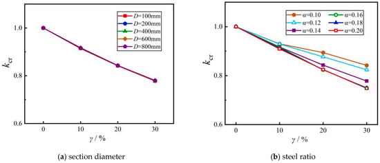 Figure 11 shows the influences of key parameters on the ultimate compressive strength of high-strength self-compacting concrete-filled steel tubular stub columns under chloride corrosion. As presented in Figure 11a, for specimens with a steel ratio of 0.14, concrete compressive strength of 60 MPa, and steel yield strength of 345 MPa, increasing section diameter obviously affects the ultimate compressive strength of columns. In Figure 11b, for specimens with a diameter of 400 mm, concrete compressive strength of 60 MPa, and steel yield strength of 345 MPa, the residual ultimate compressive strength with different corrosion rates decreases with the increasing steel ratio. The above changes are primarily attributed to the variations in the confinement effect of the steel tube. The chloride corrosion reduces the area of the steel tube, which induces a decrease in the ultimate compressive strength of the steel tube, indicating that the steel ratio significantly affects the axial load capacity of the column.