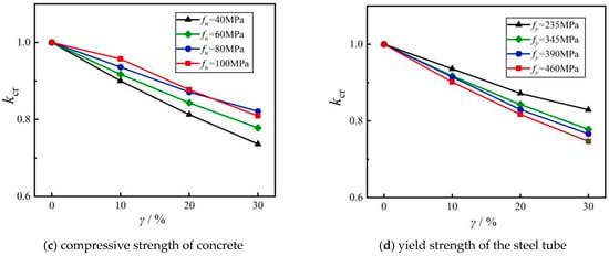 In Figure 11c,d, the residual ultimate compressive strengths increase with an increase in the concrete compressive strength, and decrease with an increase in the yield strength of the steel tube. The strengths of the concrete and steel tube have great effects on the axial load-bearing capacities. This is mainly because the steel tube is significantly affected by the variation in the chloride rate, which deteriorates the thickness and mechanical properties of the steel tube. The increase in the concrete compressive strength induces an increase in the load-carrying capacity of the core concrete. According to the analysis of key parameters, it is structurally efficient to employ the high-strength core concrete under chloride corrosion.