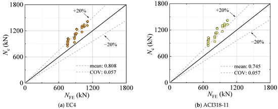 To date, there exists no available design methodology for the high-strength self-compacting CFST stub columns. The design approaches outlined in EC4 [] and ACI318 [] are compared with both the experimental and FE results to assess their accuracy in predicting the ultimate compressive strength of the columns.