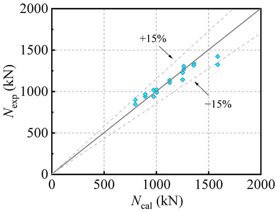In this paper, the comparison results are presented in Figure 14. The average of the NFE/Ncal is 0.993, whereas the discrepancies between the calculation of bearing capacity and the FE results of HSSC-CFST is 0.5%. The above comparisons indicate that the calculation method by adopting Equations (30) and (31) is conservative and can be used in practical engineering structures.