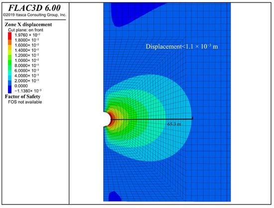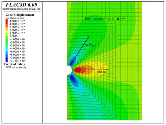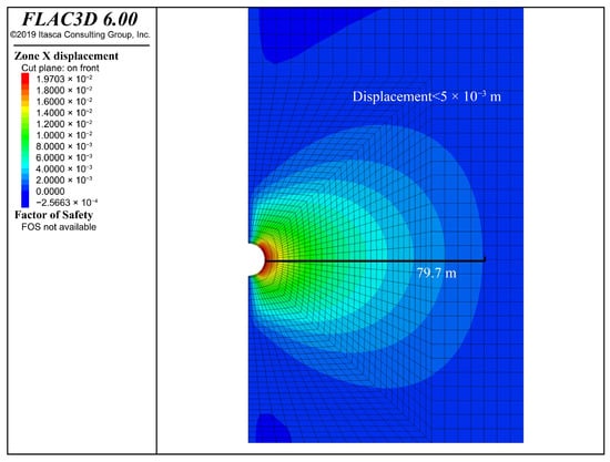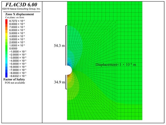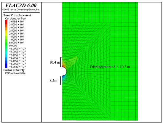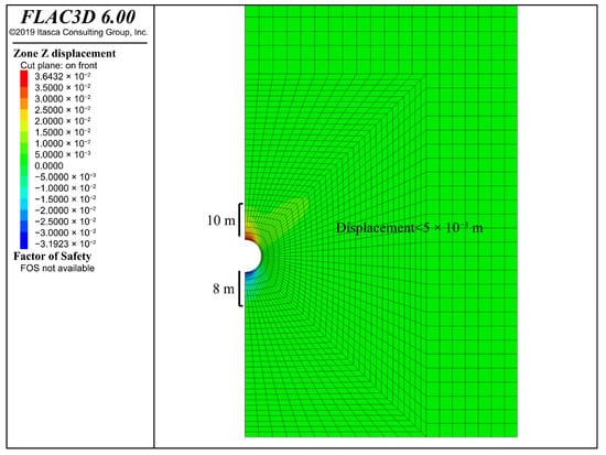 - The static analysis outcomes of the excavation phase and stable operation phase of the underground storage chamber, utilizing the finite difference method, indicate that during the excavation phase the top settlement of the chamber measures 8.633 mm, the lower end settlement is 8.727 mm, and the outer expansion at the most distal horizontal end is 0.470 mm. The stress distribution is symmetrical, and the displacement remains within an acceptable range. At the operational limit of 10 MPa, the upper settlement of the chamber measures 36.43 mm, the lower settlement is 31.92 mm, and the maximum horizontal displacement is 19.70 mm. The deformation along the Z-axis is under one-thousandth of the burial depth, and the horizontal deformation along the X-axis is below one percent of the chamber’s diameter, indicating that the chamber structure is in a secure condition.
