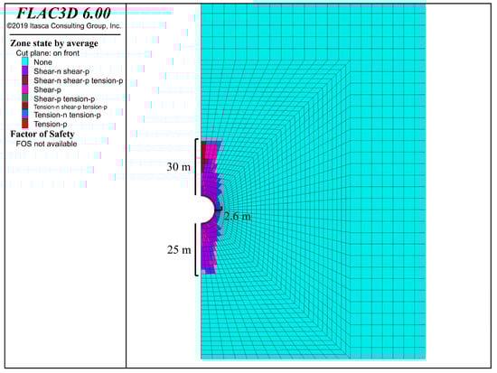 - The simulation results of the plastic zone surrounding the rock indicate that during the excavation phase, a plastic zone emerges within a 2 m radius of the chamber structure. Following the transition to the stable operation phase, the plastic zone predominantly extends along the Z-axis, with an expansion range of up to 30 m, which is less than one-fifth of the burial depth, thereby ensuring the surrounding rock remains in a safe condition.