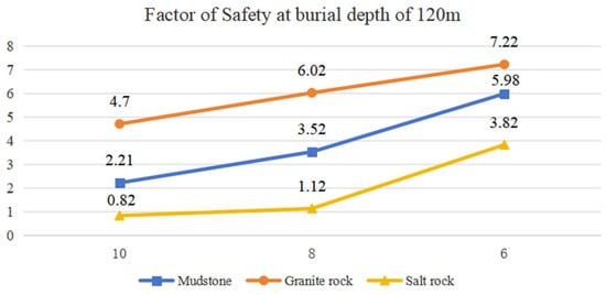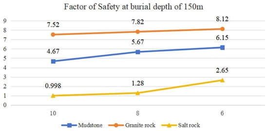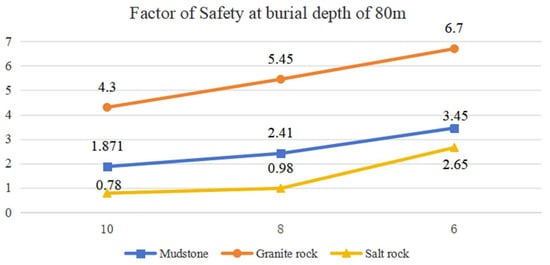 - The safety factor of the surrounding rock of the underground storage chamber is analyzed by implementing the identical numerical simulation technique based on the other two actual geological circumstances. The results indicate that in the excavation and operation of rock masses with high stiffness, such as granite, the safety factor of the surrounding rock is maximized but exhibits significant variability with respect to the factors. Conversely, in mudstone rock masses, the safety factor remains more stable and has minimal fluctuations. The salt rock mass has the lowest safety factor, falling below 1 within the 8–10 MPa range, indicating considerable instability of the rock mass. The parameter research of chamber stability establishes the foundation for site selection in the actual project.