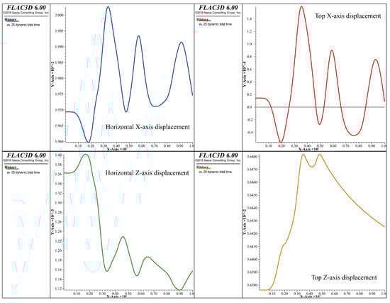 - Under a 25 Hz, 0.2 g seismic acceleration wave, the upper end’s maximum displacement was 36.49 mm, the bottom was 32.53 mm, and the post-earthquake maximum horizontal displacement was 19.76 mm. Compared with the stable operation state, the roof settlement increased by 0.1%, the bottom settlement by 2%, and the horizontal spread by 1%, demonstrating the structure’s effective seismic capacity as the post-seismic displacement remained within the safe range.