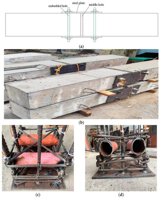 Connection of specimen joints. (a) Connection schematic diagram, (b) physical connection diagram, (c) connection method of YZ5-6, and (d) connection method of YZ7.
