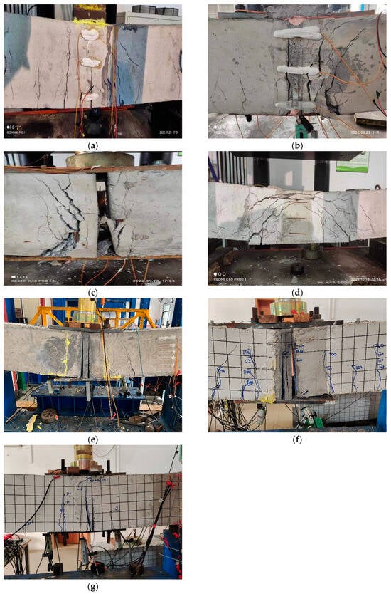 Failure pattern of the specimen: (a) YZ1, (b) YZ2, (c) YZ3, (d) YZ4, (e) YZ5, (f) YZ6, and (g) YZ7.