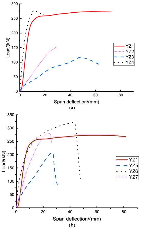 Load–deflection curves: (a) load–deflection curve of YZ1–YZ5 and (b) load–deflection curves of YZ1 and YZ5–YZ7.
