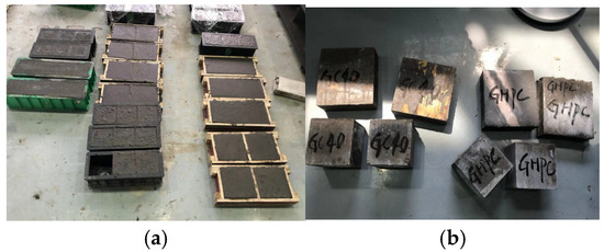 The production of geopolymer concrete blocks. (a) Prepared concrete; (b) cured concrete.