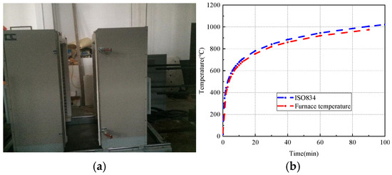 The test blocks were heated at a high temperature using an electric furnace, and the heating system adopts the ISO-834 heating curve for heating, with a heating time of 1.5 h. However, in the actual test process, it is difficult for the test furnace to achieve the ISO-834 temperature rise rate, so the test furnace temperature rise control was slightly adjusted. The heating device and furnace temperature rise curve are shown in Figure 2.