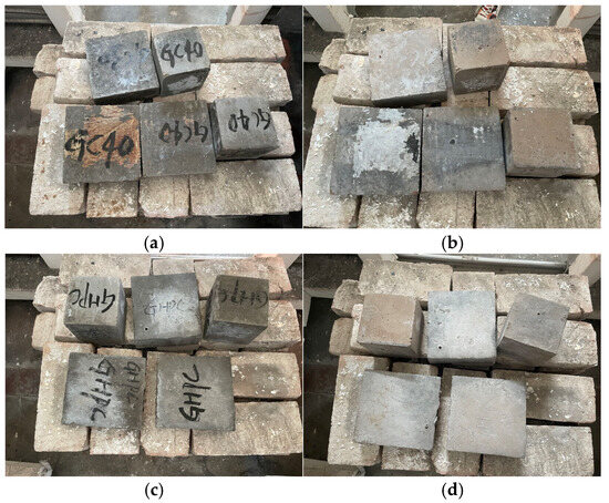 Comparison of concrete test blocks’ appearance. (a) GC40 appearance before test; (b) GC40 appearance after test; (c) GHPC appearance before test; (d) GHPC appearance after test.