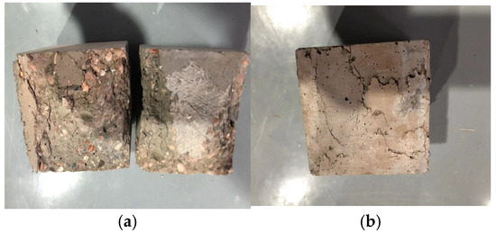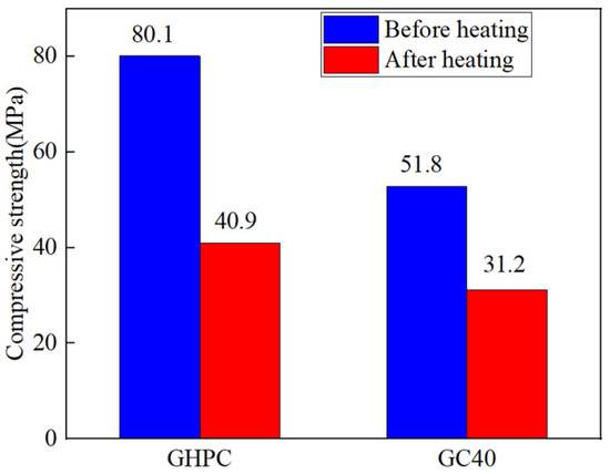 The compressive strength of the GHPC and GC40 test blocks before and after exposure to high temperature was tested to obtain their compressive strength, and then compared. The test block for compressive strength test was a cube with a side length of 150 mm. The loading rate was set at 0.5 MPa/s during compression. The maximum pressure value of the test block when it was damaged was recorded to calculate the compressive strength. The appearance after compressive test is shown in Figure 4. Table 4 and Figure 5 show the residual strength after exposure to high temperature, and the residual strength rate of two sets of test blocks with added geopolymers exceeds 50%, while the ordinary concrete is generally about 20%.