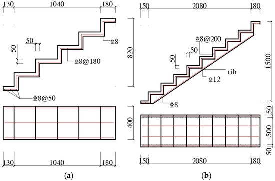 Structural design of stairs (unit: mm). (a) GHPC-Z-type folded unribbed set of stairs; (b) GHPC-Z-type folded ribbed set of stairs.