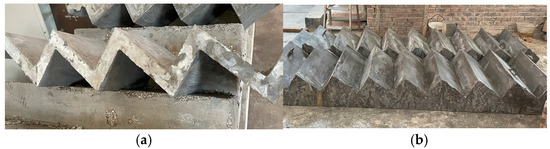 Two sets of stairs were designed in the experiment, one of which was a GHPC-Z folded plate unribbed set of stairs and the other was a GHPC-Z folded plate ribbed set of stairs, and both sets of stairs were 50 mm thick. These two sets of stairs were prefabricated stairs made from the GHPC material tested in Section 2. The dimensions of the GHPC-Z-type folded plate unribbed set of stairs and GHPC-Z type folded plate ribbed set of stairs are shown in Table 5. The material characteristics of the steel reinforcement of the stairs are shown in Table 6, the structural design of the stairs is shown in Figure 6, and the completed set of stairs was fabricated as shown in Figure 7. Both the GHPC-Z folded plate unribbed set of stairs and the GHPC-Z folded plate ribbed set of stairs were tested by non-stowed combustion.