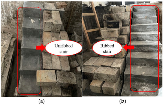 Exterior view of the completed stairs. (a) GHPC-Z-type folded unribbed set of stairs; (b) GHPC-Z-type folded ribbed set of stairs.