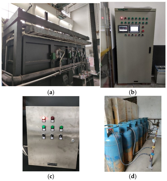 Fire test heating device diagram. (a) Horizontal fire test furnace; (b) controller; (c) ignition system; (d) gas supply system.